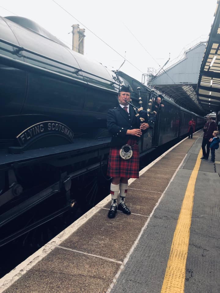 Flying Scotsman & Bagpiper- in Preston, Lancashire.