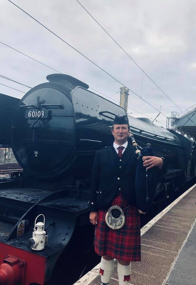 Malcolm Smith is a Scottish Bagpiper who pipes regularly for events in Preston & Lancashire. Corporate Events, Weddings, Birthday Parties and Funerals. Malcolm recently performed for as the Flying Scotsman travelled from Manchester to Preston and Carnforth. (Flying Scotsman & Bagpiper)